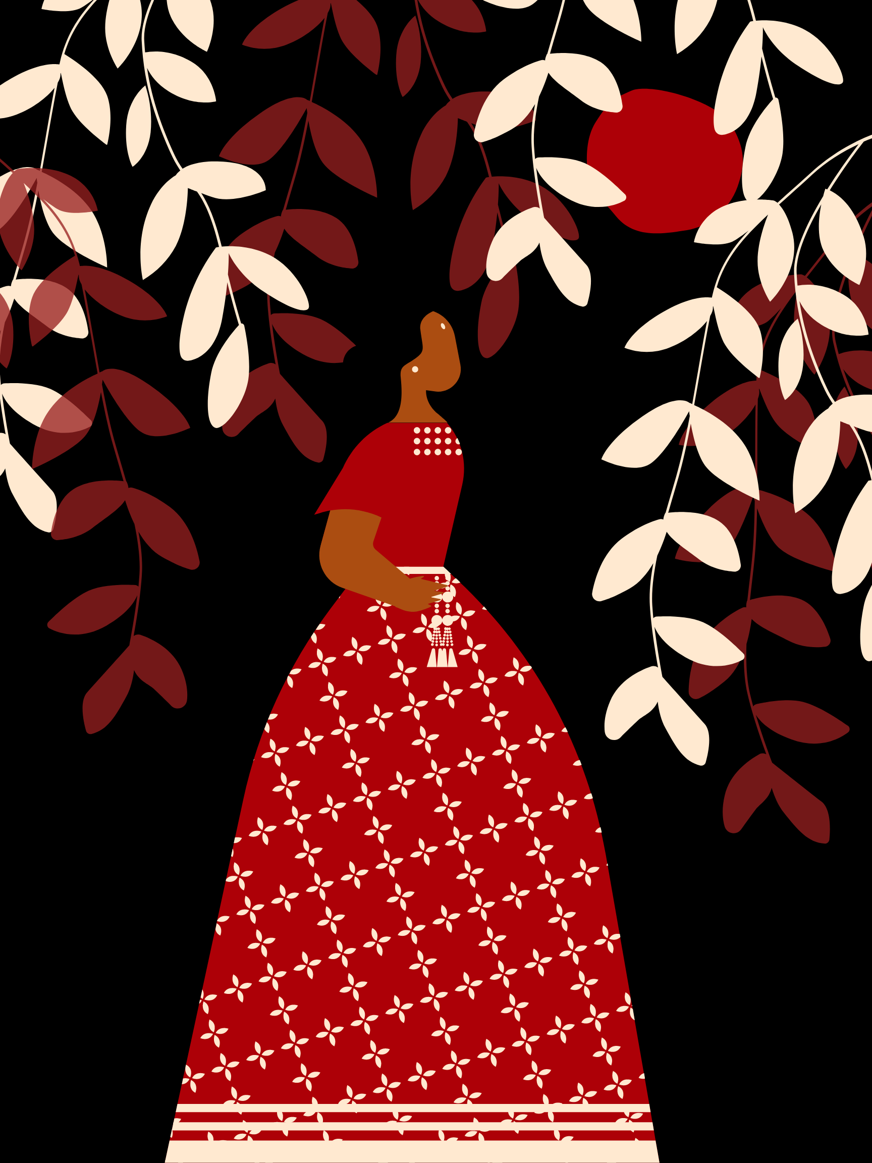 For lovers of bold aesthetics and modern bohemian decor, this stunning digital artwork is a perfect addition to your space. Featuring a strong yet graceful woman dressed in an intricate red pattern, this piece is set against a striking black background, creating a sense of mystery, elegance, and empowerment.
